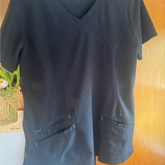 Stylish black scrub top with a V-neck. Features a blue trim for a pop of color.