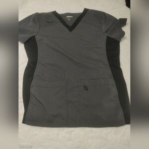 Stylish V-neck top by Scrubstar. Charcoal front with black side panels. Ideal for work or casual wear.
