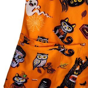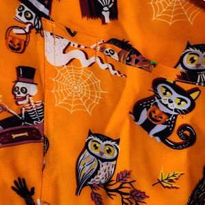 This women's size medium scrub top is new with tag attached. It is orange with an all over Halloween print. There are ghosts, Frankenstein's monster, spiders, monsters, owls, skeletons, and more. It is a short sleeve v-neck style with front pockets.