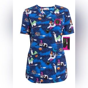 Vibrant scrub top with a fun Halloween theme. Features playful designs on a blue background.