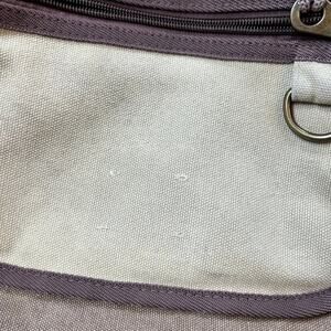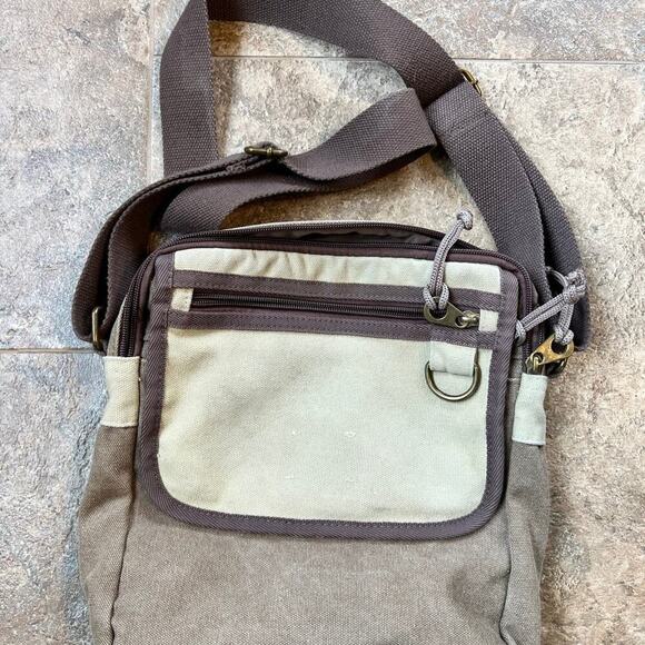 Preowned SCRUFFY DOG messenger bag. Can be used by either man or woman. Distressed canvas with adjustable strap. Has key ring, outside zipper on flap, under flap has a zipper also with magnetic snaps to hold closed. Inside has another key ring and padded pocket and zipper pocket. Two larger phone size pockets & 2 pen size pockets in side. Brown & tan canvas.