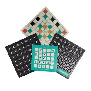 This is a complete, never -used Scrumble magnetic refrigerator crossword word game. Designed by Brass Monkey in Kansas City, MO. In excellent condition with minor shelf wear to the box (pictured). All pieces, board, and instruction booklet are intact.
