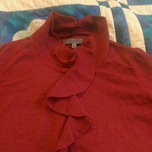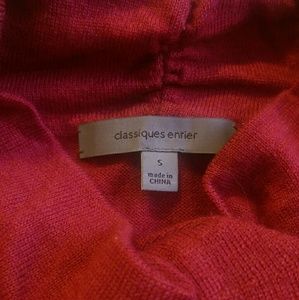 Classiques Entier, a high quality Nordstrom brand. 100% merino wool is lightweight, soft, and just-right warmth. Color is raspberry purplish-red (last photo most true). Stand collar with cascading ruffle down front. Deep fine-rib hem (4.5") and cuffs (6.5"). Flat measurements below; as this is a knit, it does have stretch.