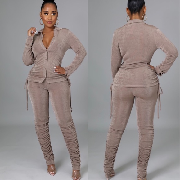 Two piece set, Collar, V neck, Long sleeves, Button closure, High waisted pants, Elastic waistband, No closure. Scrunch side tie
