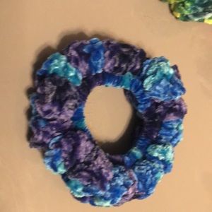 Hand made velvet scrunches. Fit grand daughters up to adults. Does not break hair off. Wash by hand in sink. Green mingled color, blue and purple mingled, and red, white and blue mingled