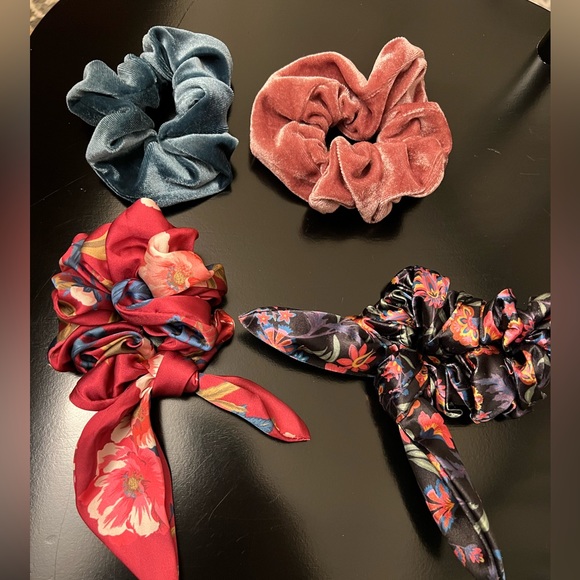 Set of four scrunchies from LOFT. Two have a satin finish with bow detailing, two are crushed velvet. Each used once.