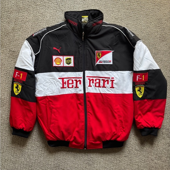 Dynamic Scuderia Ferrari jacket featuring bold red, black, and white colors. Adorned with iconic Ferrari logo and sponsor patches.