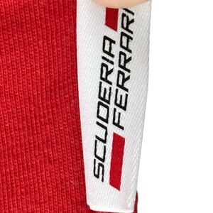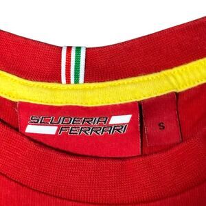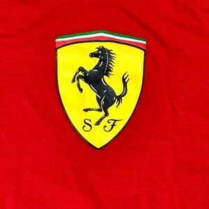 The product is a men's small red Scuderia Ferrari T-shirt featuring the iconic prancing horse logo, symbolizing the Formula 1 race team. This shirt is a must-have for fans of racing, specifically Formula 1, showcasing their passion for the sport through their favorite team, Scuderia Ferrari. The red color and shirt design make it a stylish and comfortable apparel for supporters of the team and the sport of racing.