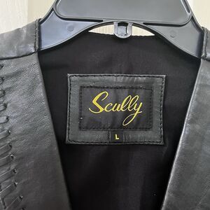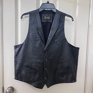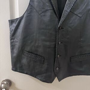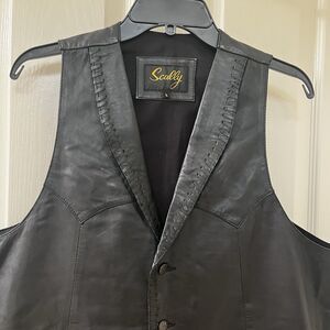 Scully Black Leather Vest Whip Stitch Lapel Pockets Lined Men's Size Large. The leather is so soft to the touch. Has been worn and there are some marks, discoloration on the back, wear and scratches to the leather. Please see the pictures. A great piece with a ton of life left, but has been used and the leather does have some wear.