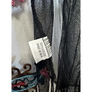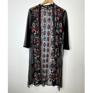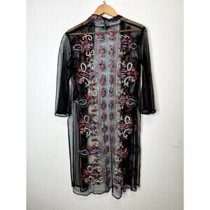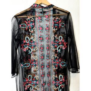 Elegant sheer blouse with colorful embroidery. Features intricate floral patterns. Perfect for layering.