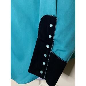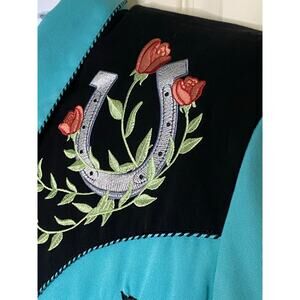 This item, designed with 35% rayon 65% polyester, features poly/rayon blend snap front blouse and horseshoe/rose embroidered yoke .