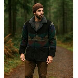 Step into timeless Western heritage with this vintage, rugged Scully Southwestern jacket. Crafted with a rich mix of suede and wool-blend fabric, it features a bold Aztec-inspired pattern across the chest and sleeves, accented by a warm sherpa-lined collar. A true statement piece that balances vintage character with modern wearability.