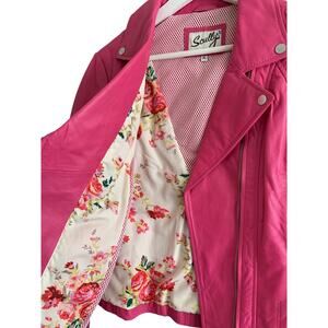 Distinctive Pink Hue: A striking and fashionable pink color that stands out from classic black or brown moto jackets.