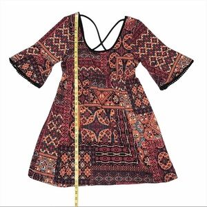 Soft stretchy dress by Scully in a colorful red, blue, black and coral print. Criss cross straps in the back. High waist. Fitted in the bust and relaxed and flowy from the waist down. 3/4 length bell sleeves with cute crochet trim. Excellent condition. Machine washable. Size medium and extremely stretchy. See photos for exact unstretched measurements.