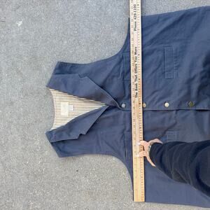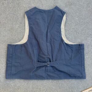Durable 100% cotton canvas vest. Notched lapels, four pockets and an adjustable back strap. Fully lines with 100% cotton stripe fabric.