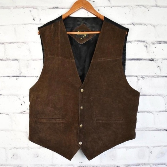Stylish brown suede vest by Scully. Features button closure and two front pockets. Perfect for layering.