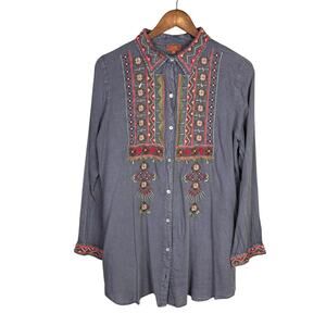 Scully Vintage Wash Gray Embroidered Button Up Long Sleeve Western Tunic Top