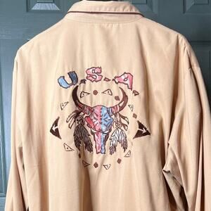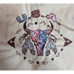 Keywords: western shirt, cowboy shirt, embroidered shirt, bull skull, USA, rodeo, country, vintage western, long sleeve, button down, novelty shirt, costume shirt