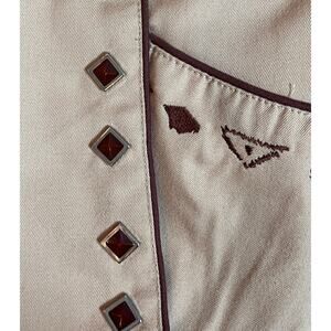 Eye-catching vintage western shirt featuring intricate embroidery details. This tan-colored shirt has a classic cowboy style with decorative stitching, two chest pockets, and distinctive square buttons. The back showcases a bold bull skull design with "USA" lettering, creating a unique country and rodeo vibe. The long sleeves and comfortable fit make it ideal for casual wear, costume parties, or adding a touch of western flair to your everyday wardrobe.