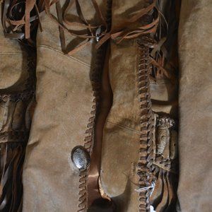 This is a wonderful men's XL Brown Leather Western Jacket. It was lightly worn and has silver buttons down the front. There is fringe that hangs about 10" along the seam in the back and between the center of the front. It also hangs from the patch pockets. There is beadwork over the shoulder and on the sleeve and back.. Leather braiding around the edges. Measurements: Down Front: 31", top of sleeve: 26", Bottom of sleeve: 18.5, Side Seam: 22", Under arm to under arm: 25" Middle back: 34", and across back seam: 20". It is in very nice shape.