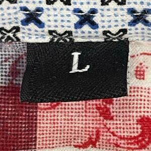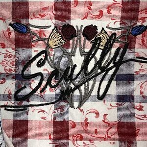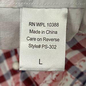This is a men's Scully Western shirt in size Large, featuring a red plaid pattern with paisley embroidery. The shirt has a collared neckline, long sleeves, and a snap closure with pearl snaps. Made from 100% cotton woven fabric, this cowboy-themed shirt is suitable for travel and casual occasions in all seasons. The design includes accents such as pearl snaps and a cutaway collar, giving it a classic Western flair perfect for outdoor settings.