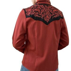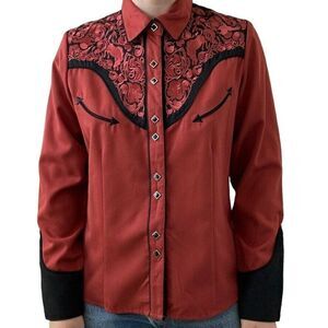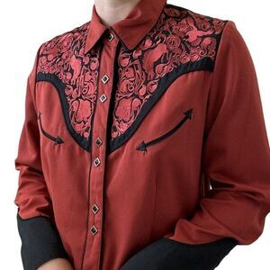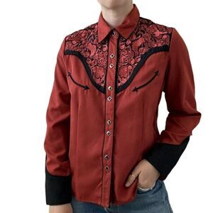Scully Womens Western Rodeo Ranchwear Orange Floral Embroidered Pearl Snap Shirt