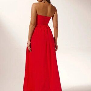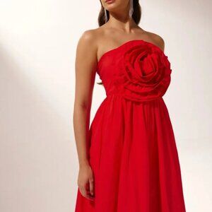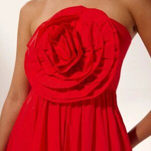 Strapless Gown, Rose Detail At Bust, Gathers At Waist, Maxi Length.