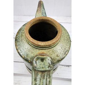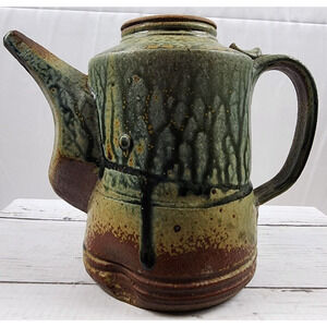 Mid-Century Modern sculptured studio art pottery piece, handmade abstract pitcher by Monsarrat. Matte finish, earth tone drip glaze, decorative handle, measuring approximately 6.5" tall, 4.5" wide, 4.5" around (vessel, without handle and spout). Crafted in Tennessee in the United States during the 1980s, is signed by the artist, weighs 3 lb.,1.6 oz. Care instructions recommend spot cleaning only. This pitcher does not have a lid (I know other of the same item does show with a top/lid).