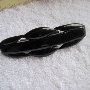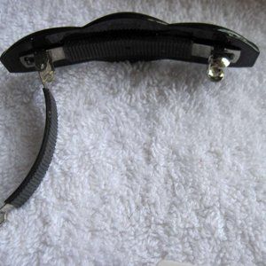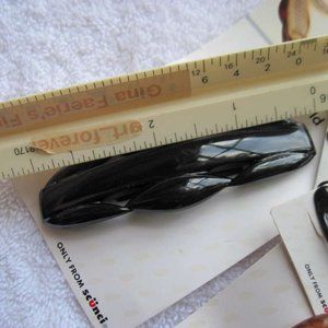 Pictured design plastic in your choice of Amber with Gold, Darker Amber, or Black colors pictured hair barrette with stay put slide proof secure fit rubber teeth on metal backing closure.