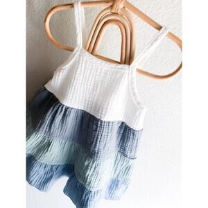 This sweet little multi-colored dress is made from gauzy muslin material and features sweet yet subtle tiers. The tones on this are divine, reminds me of sea meets the sky shades. Simple but darling! Meant to be swingy/roomy in the body.