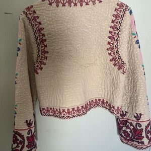 Stylish beige jacket with detailed red and black embroidery. Features a button closure.