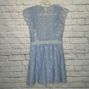 Sea Blue and White Eyelet Flutter Sleeve Embroidered Dress. Elegant blue and white dress with intricate embroidery. Features scalloped sleeves and a flattering fit.