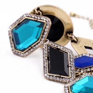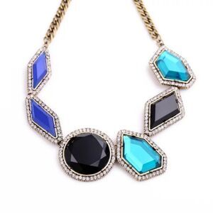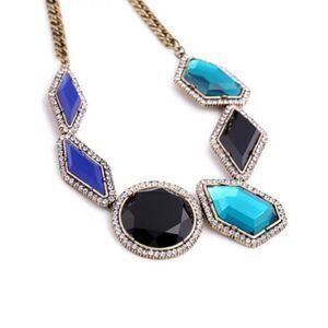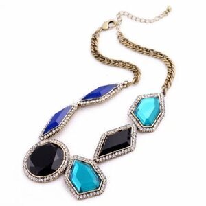 Sea Blue Resin Rhinestone White Crystal Vintage Gold Statement Necklace