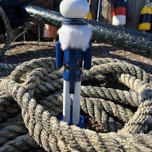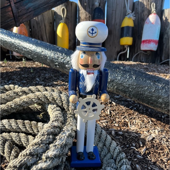 Dressed in nautical blue and white our sea captain nutcracker is ready for another sailing journey. He is holding a ship’s wheel.