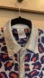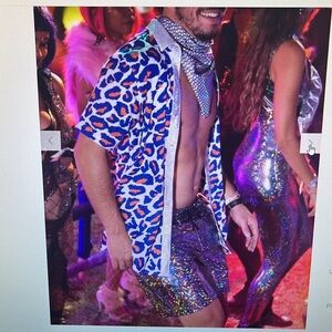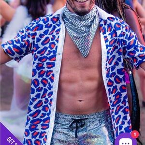 Measurements pit to pit flat back is 20” inches and 30” inches from nape to center hem. Slim cut item. Button down with blue / orange cheetah pattern. The silver trim fabric is soft and sparkling! Main fabric is hand printed Batik Cotton. Hand made item. Freshly washed and air dried. Could be ironed to look it’s best. Smoke and pet free home. Super stretchy, referencing the website for their sizing; shirt should fit up to a 38” inch chest, 37.5” waist.