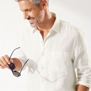 Sunset on a secluded beach. The last light of day bathes swaying palms. Digging your feet into the warm sand. That's the relaxed feeling you'll have when you wear this incredibly lightweight shirt. Made from soft premium linen for comfort in warmer weather, it's pigment printed with a solid color for an incredible look that gets better over time. A front pocket provides the perfect spot for your Havana or wraparound shades.