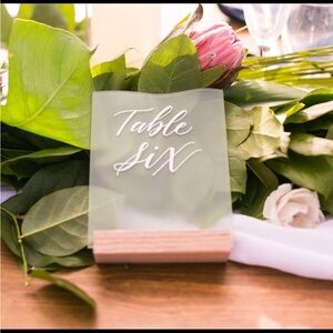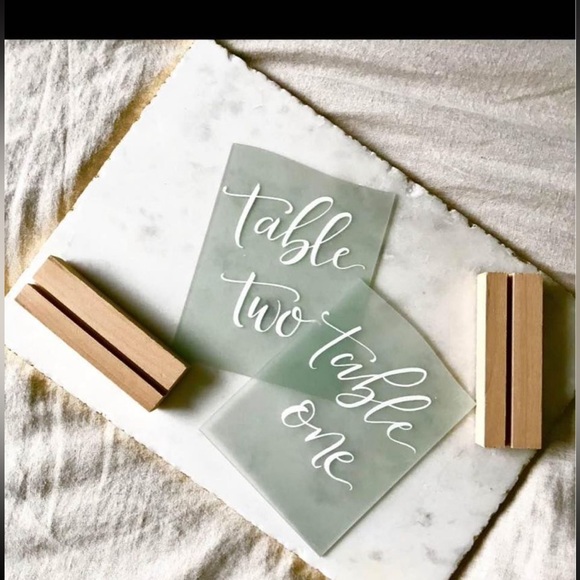 Sea glass table numbers with natural wood bases add an airy, beachy feel to your tables. Each piece is hand cut and painted to recreate the effect of surf tumbled glass. All lettering is done by hand in waterproof acrylic ink. Shown here in sea green, but glass can also be made in aqua, light blue, dark blue, pink and gray. Glass measures approximately 5x6.5 inches - wood bases included.