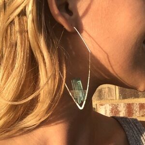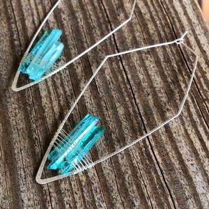 These stunning geode threader earrings are sure to draw eyes! Mint crystals delicately threaded in silver wire and set in geometric silver wire hoops that are hammered flat at the bottom. Perfect for any occasion! Lightweight and comfortable for all day wear.