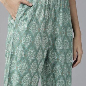 Sea Green Golden Print Straight Kurta Trousers and Dupatta Set Kurta design:Gotta_Work Straight shape Regular Sleeves Three-Quarter Sleeves Round Neck Calf Length Gotta on yoke and sleeve with Straight hem Rayon machine weave fabric Trousers design:Printed Trousers Slip-On waistband Size & Fit Material & Care Rayon Hand wash