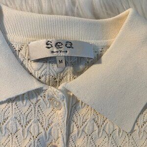 "Sporty" and lovely pointelle sweater in cream. Polo style with three buttons and collar. It's perfect with jeans or can be worn under a blazer for work. In excellent condition -- only worn once. Viscose material with some stretch to it. Form fitting (runs small), but feels very comfortable on you.