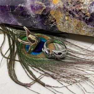 Sea Life Ring Set (2 pcs) in good condition. Set features a gold toned whale tail and silver toned dolphin ring. Rings are NOT adjustable. Size is approx. 9. Shows signs of wear.