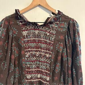 I adore this super pretty designer Sea New York black blue red embroidered floral smocked long sleeve maxi dress with zipper back and pockets