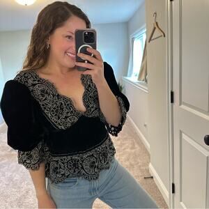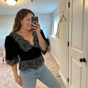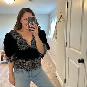 I adore this super pretty designer Sea New York black and white floral lace velvet v neck puff sleeve blouse/top
