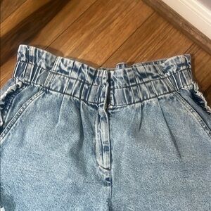 Stylish blue jean shorts. Features ruffled edges. Elastic waistband for comfort.