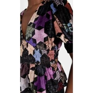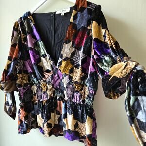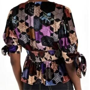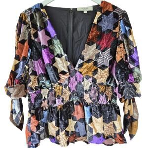 Sea New York Estella soft velvet blouse with black multicolor graphic star printed fabric, plunging v-neckline, smocking at waist, elbow-length puff sleeve, and large ties at cuff. Rare, sold out style, no longer in stores.