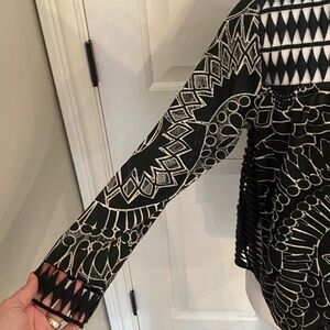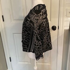 Sea black eyelet blouse with lined body, unlined sleeves, cropped sleeves, single button closure at nape, eyelet details at chest, cuffs and sides and abstract print throughout. Made of 80% cotton and 20% polyester. Sleeves have mesh and crocheted sheer panels. Sides are crocheted sheer. Body is lined and not sheer