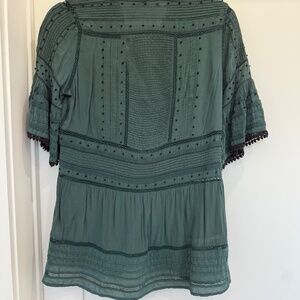 Sea New York Green Blouse with sheer crochet detailing. Top button notch slightly worn.