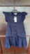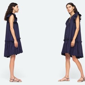 Elegant navy dress with ruffle sleeves, perfect for any occasion.