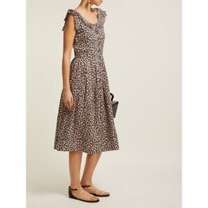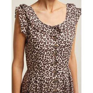 SEA Lottie Leopard-print Midi Brown Dress, Sea Lottie Midi Dress in Natural, Scoop Neckline, Ruffle Detail at Neck and Sleeves, Button Front, A-Line Silhouette, Nude Natural Cream Tan Brown Beige Leopard Print, Animal Print, Midi Length, Lined, Size 2, Animal Print, 100% Ramie, Pleated Detail