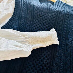 The Melanie cable stitch combo sweater features voluminous cotton balloon sleeves with smocked detailing around the cuffs and cable stitch merino wool body.